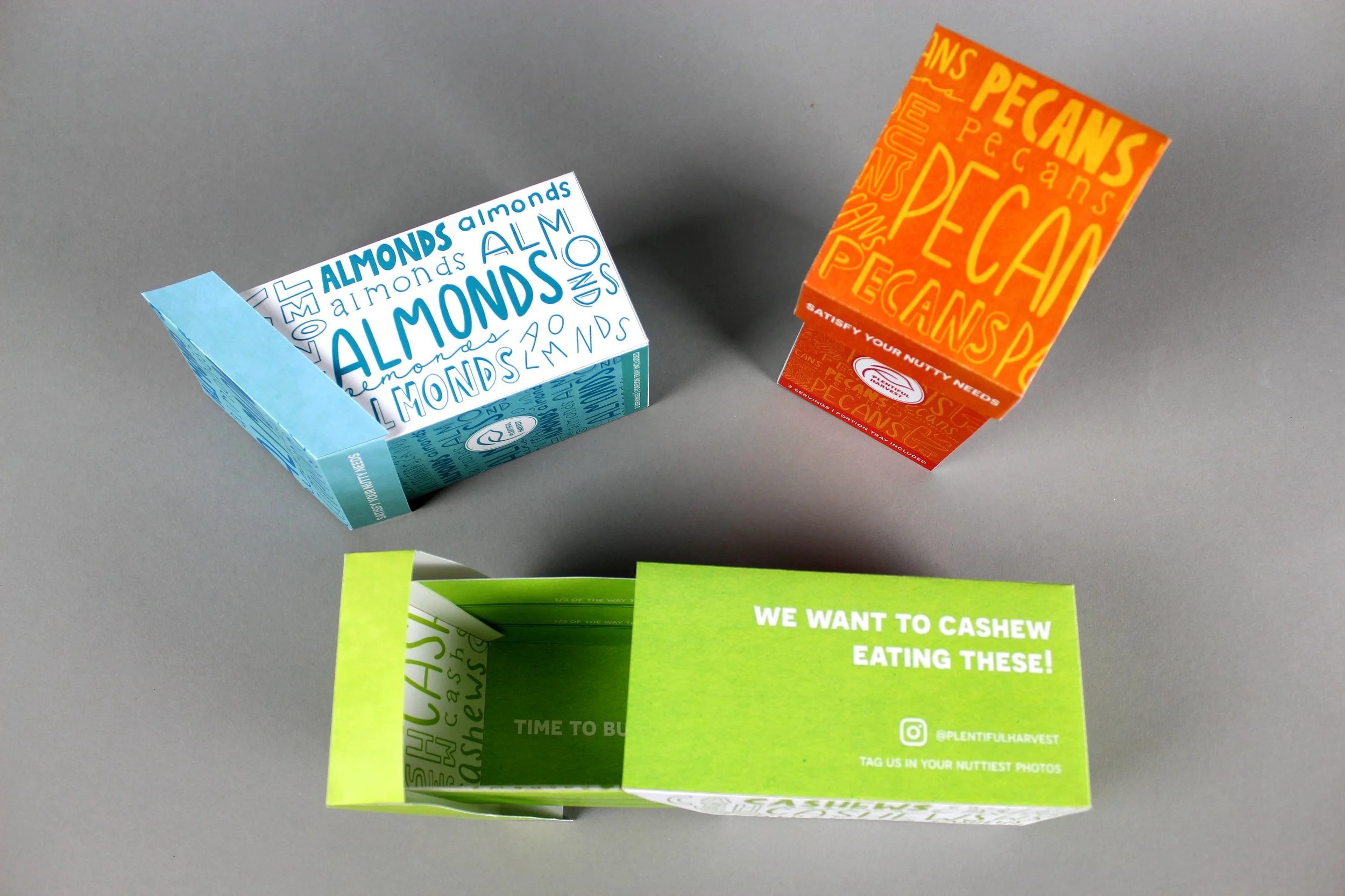 Each box has its own witty punchline on the side that relates to the corresponding nut. This relays a friendly and inviting brand and brings a smile to the consumer.