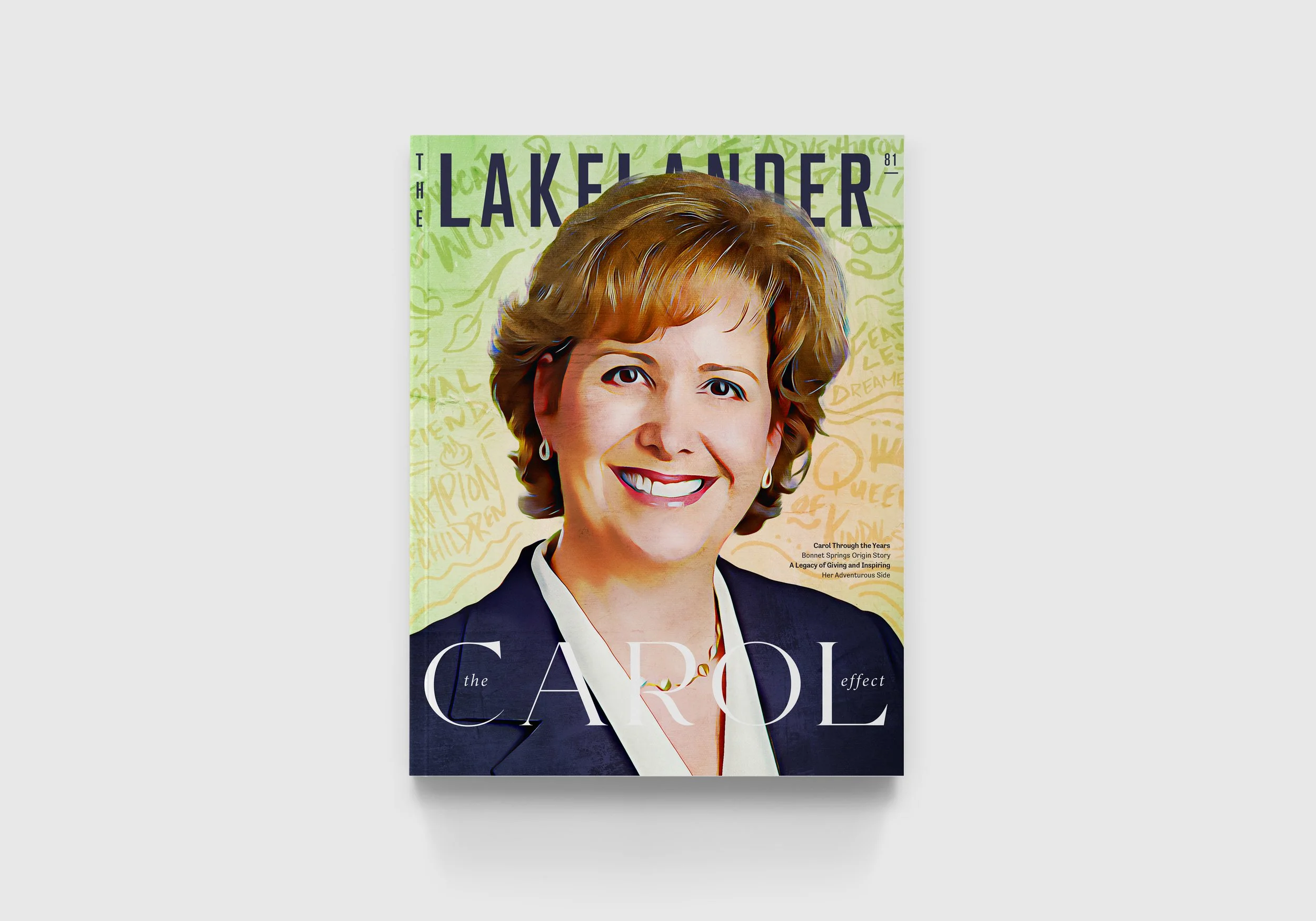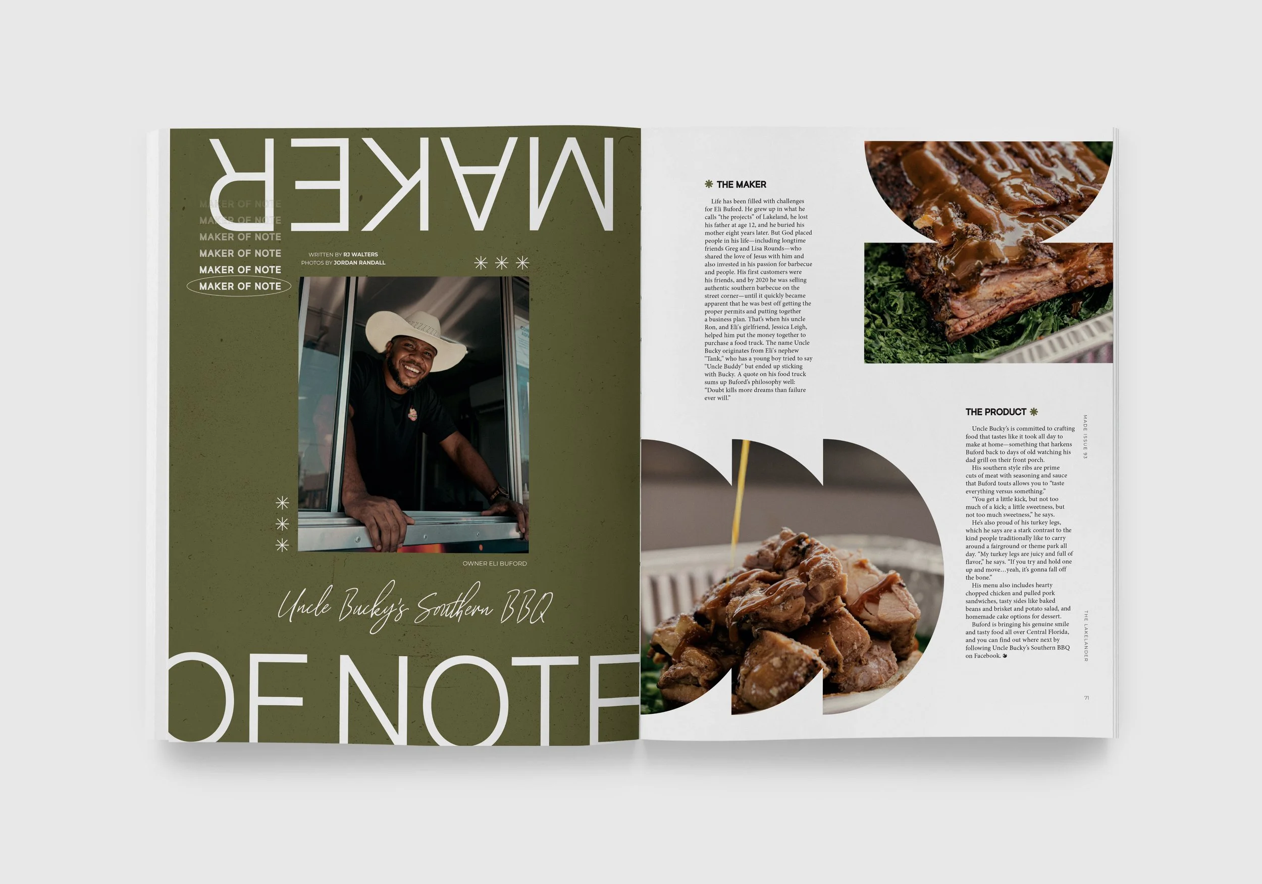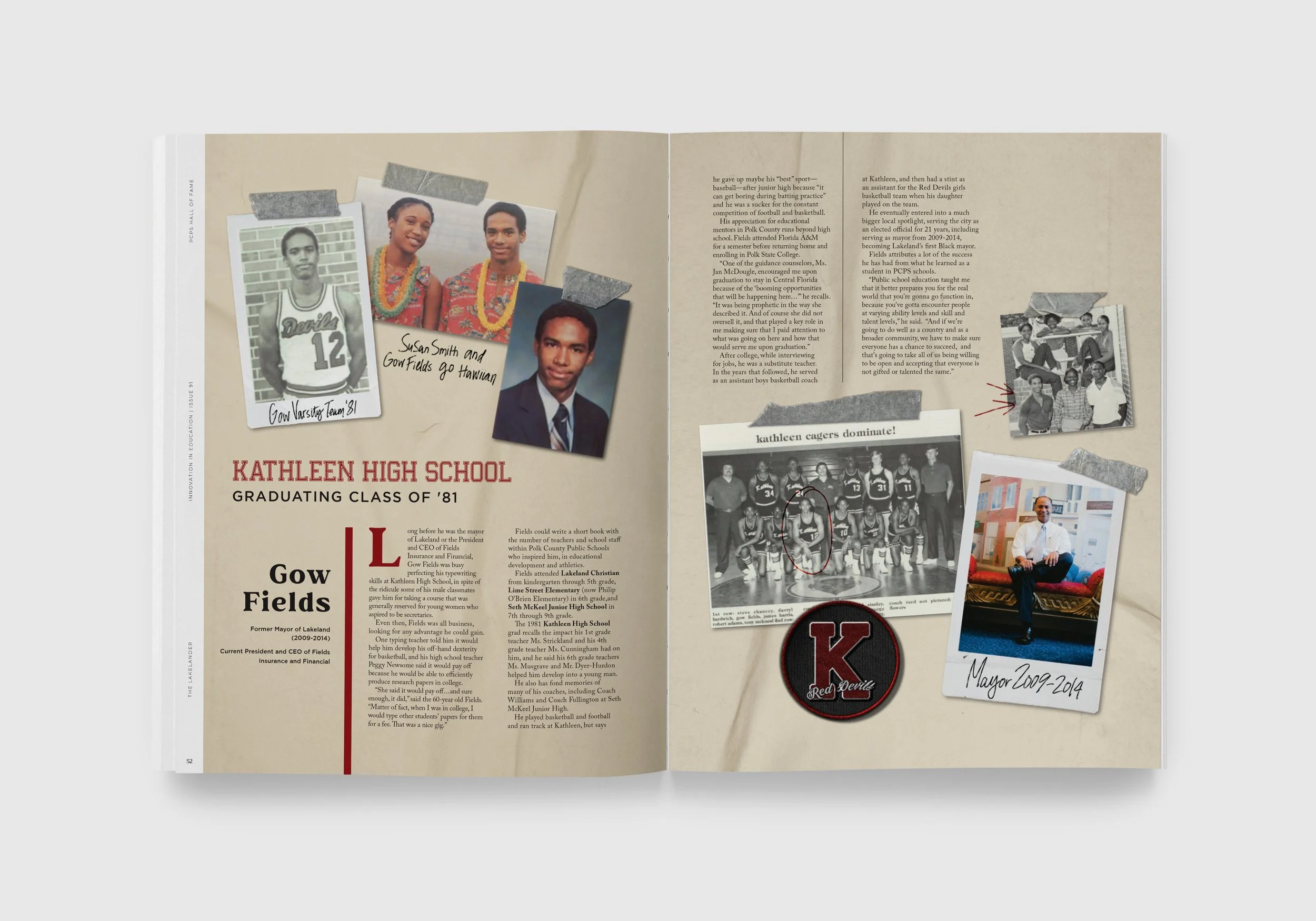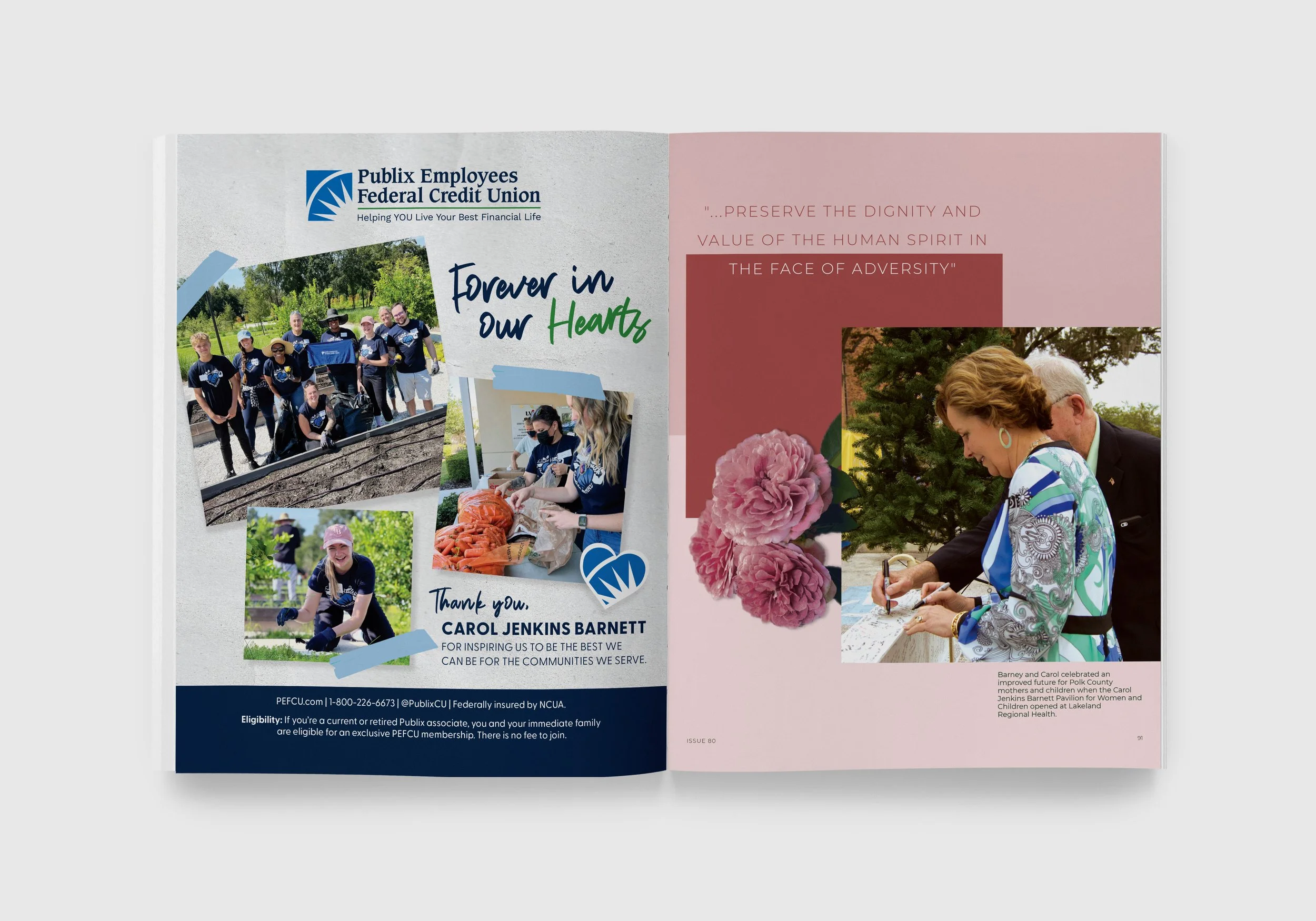This was the first issue that I had the opportunity to contribute in The Lakelander. The entire issue is dedicated to a Lakeland icon, Carol Jenkins Barnett. The feature displayed below discusses how Carols philanthropy work shaped the community, so soft color tones and imagery of flowers were used to demonstrate her kindness. A feminine typeface was chosen to match her welcoming persona and the staggered images keep the reader engaged while maintaining a directional flow.